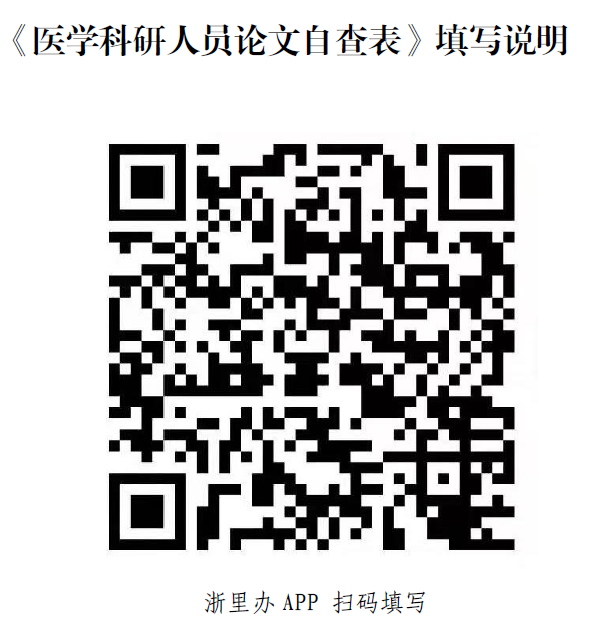 (三)自查材料上交要求。各单位应认真组织列入自查范围的存量学术论文所有作者(含共同通讯作者和共同一作)通过浙里办APP填写《医学科研人员自查表》(详见附件1-浙里办APP操作说明)。《自查表》(样表见附件2)打印后由作者本人签名学院盖章后于2021年10月26日前报科技处联系人。《自查表》电子材料请发送至科技处联系人邮箱。直属附属医院上述自查材料由医学院统一安排收存。