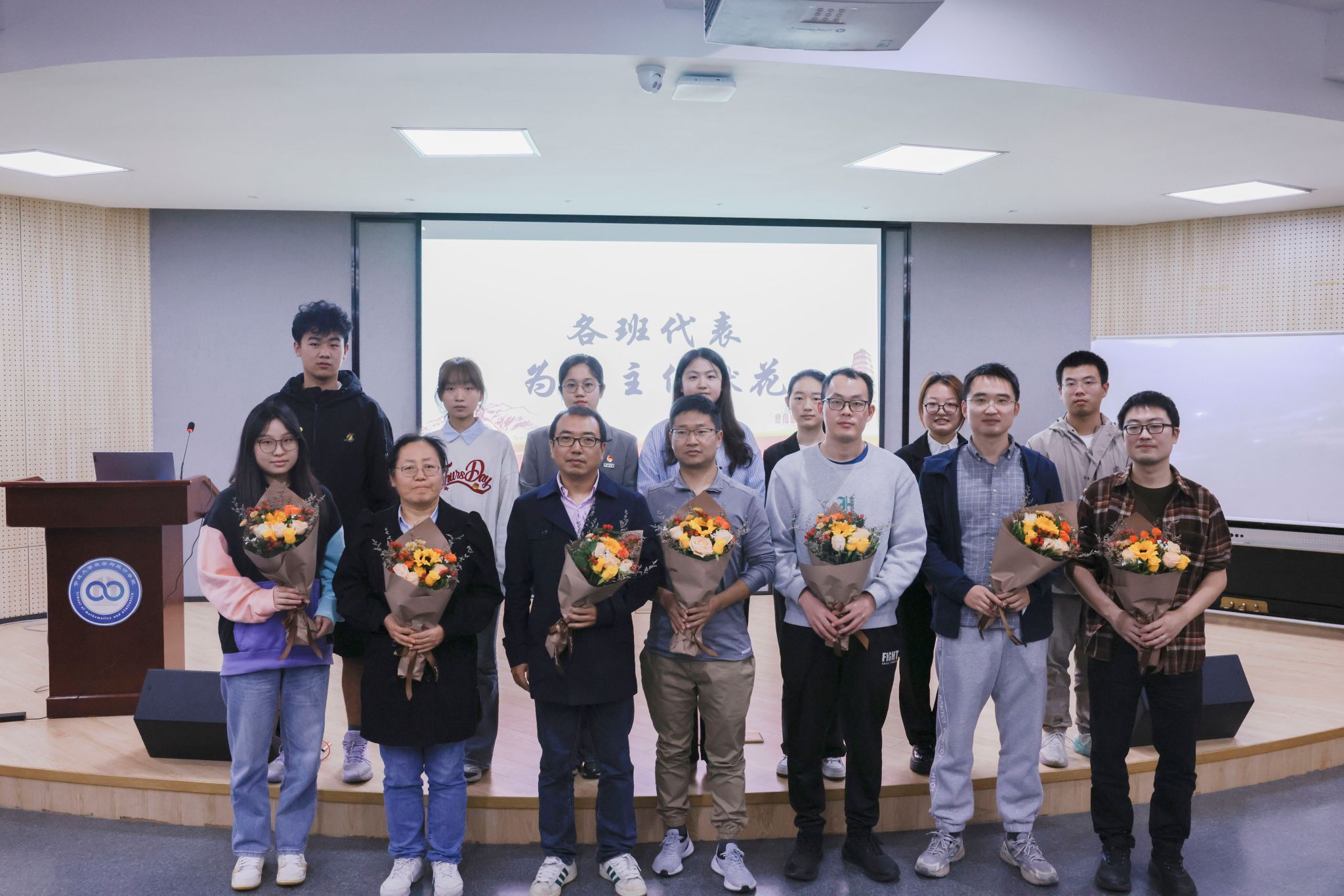 班团建设的成功离不开班主任老师们的辛勤耕耘和默默付出。活动第二环节,全场同学以热烈的掌声欢迎各班班主任上台,各班代表手捧鲜花,向老师们献上鲜花,表达最深切的敬意和感激之情,场面温馨而感人。