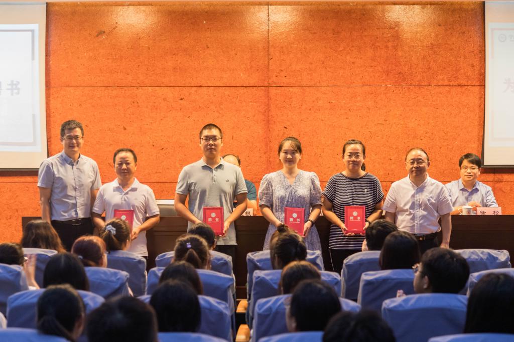 在代表们的精彩发言后,各班新生代表们在主席台上佩戴院徽胸章,成为正式的数学人。并接受赵峻老师对大学生活的建议,后由屈院长为新生班主任颁发聘书。