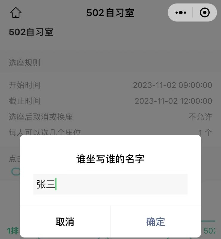 第二步, 线上的座位号即对应自习室座位上张贴的序号,点击目标座位,填写自己的名字,点击确定。