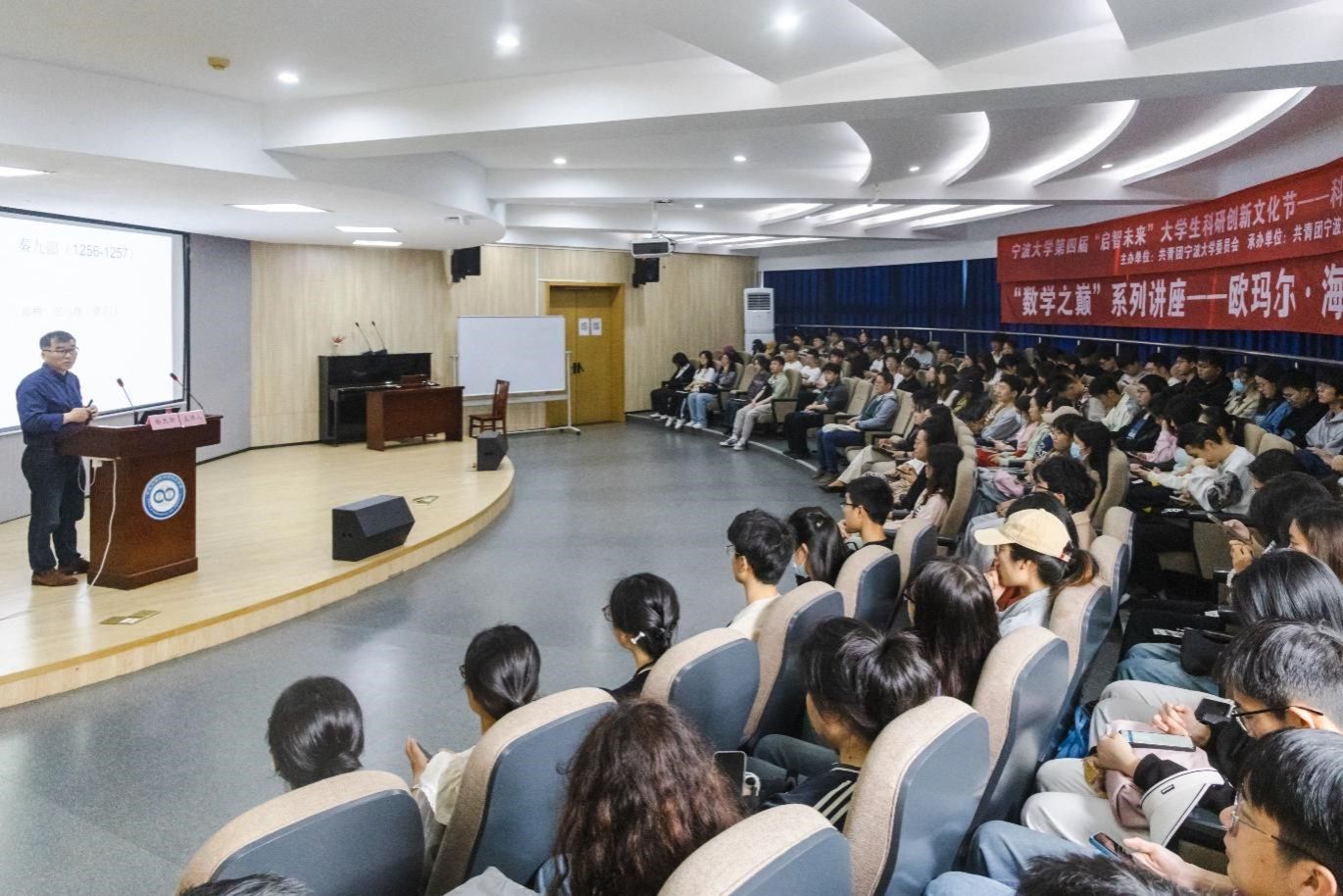 为提升学院数学文化建设,开拓学生数学视野,4月15日,浙江大学蔡天新教授应邀来我院为近百名师生作题为《欧玛尔·海亚姆的世界》的数学文化讲座。讲座由院党委书记霍妍主持。