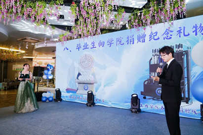 随后,全体24届本科生为答谢学院的四年培养,捐赠了一座象征时间守望者的"日晷"石雕。这座石雕不仅承载着光阴的故事,更寓意着学院新元肇启,华章日新;而全体研究生则为学院的各楼层添置了爱心伞架,它们如同温暖的臂膀,为师生提供关怀与庇护,体现了对学院大家庭的深情厚谊。
