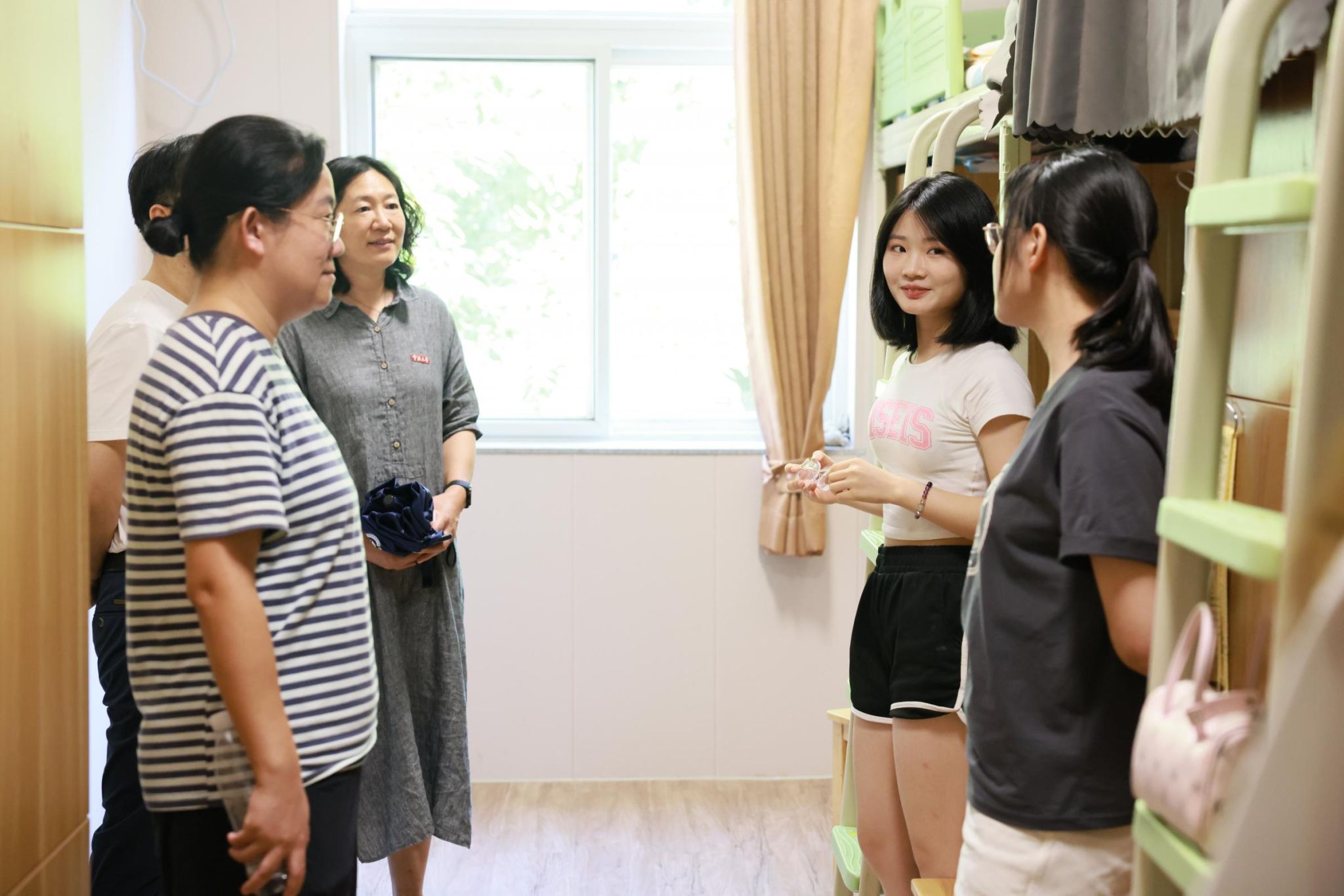 党委书记霍妍、党委副书记姜萍、副院长徐松、副院长李莉、工会主席李茂华及新生班主任、辅导员一行走进新生宿舍,与同学们“拉家常、聊近况、话学业”,送上来自51吃瓜