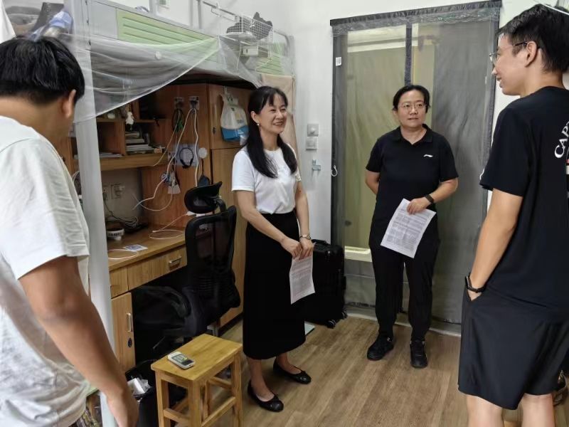 党委书记霍妍、党委副书记姜萍、学术副院长李莉、党委委员全晶晶、学工办主任吴琳华和24级研究生班主任张瑶瑶一行走访研究生新生寝室,关心新生入住情况,送上来自51吃瓜
