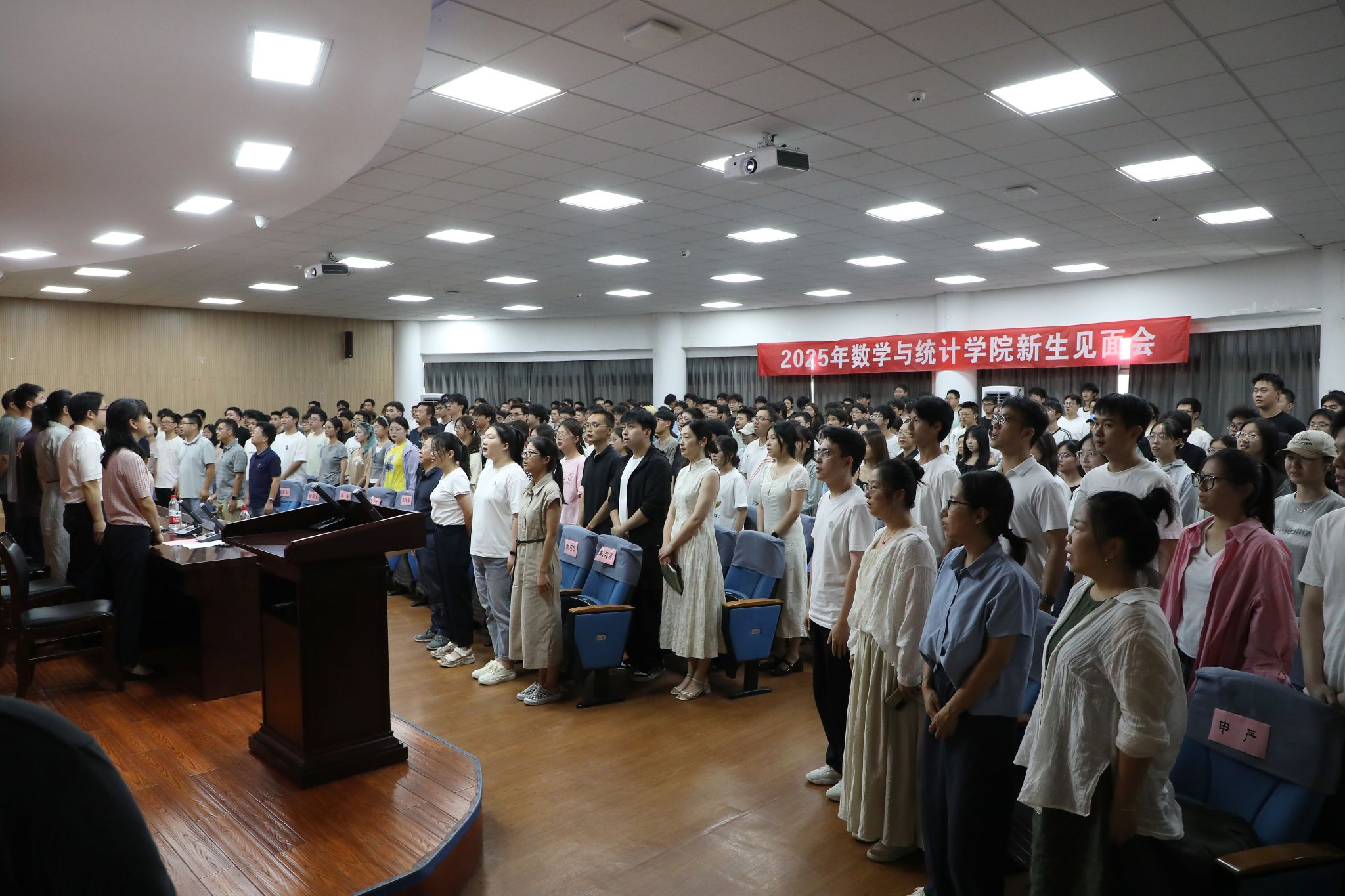 最后,霍书记在讲话中带领新生回顾数院的光辉发展历程,展示了学院目前在学科建设、人才培养和国际合作上的显著成就。她以“筑牢根基”“强健体魄”“提升本领”三个方面为基点,寄语新生在新起点上坚定理想信念、涵养家国情怀;以昂扬姿态锤炼健康体魄、夯实学术根基,勇于探索、敢于创新;把个人理想与时代使命紧密结合,用数学智慧服务国家战略、回应社会关切,在数院沃土上书写无愧于青春的华彩篇章。