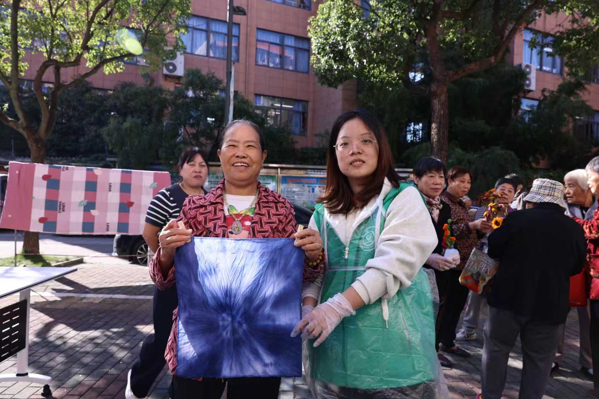活动现场,小“数”苗们早早布置好各类手工区域。插花桌前,大家围在老人们身边,耐心地协助老人精心挑选干花与扭扭棒花,进行组合搭配、修枝造型,一个个错落有致的花艺作品逐渐呈现。在讲解扎染技巧的过程中,小“数”苗们放慢语速、反复示范,细致地指导老人们掌握折叠绑扎、浸染颜料的力度与手法,在布帛上勾勒出蓝白交织的独特纹样。一方方染巾在阳光下轻轻摇曳,宛如绽放的传统艺术之花。