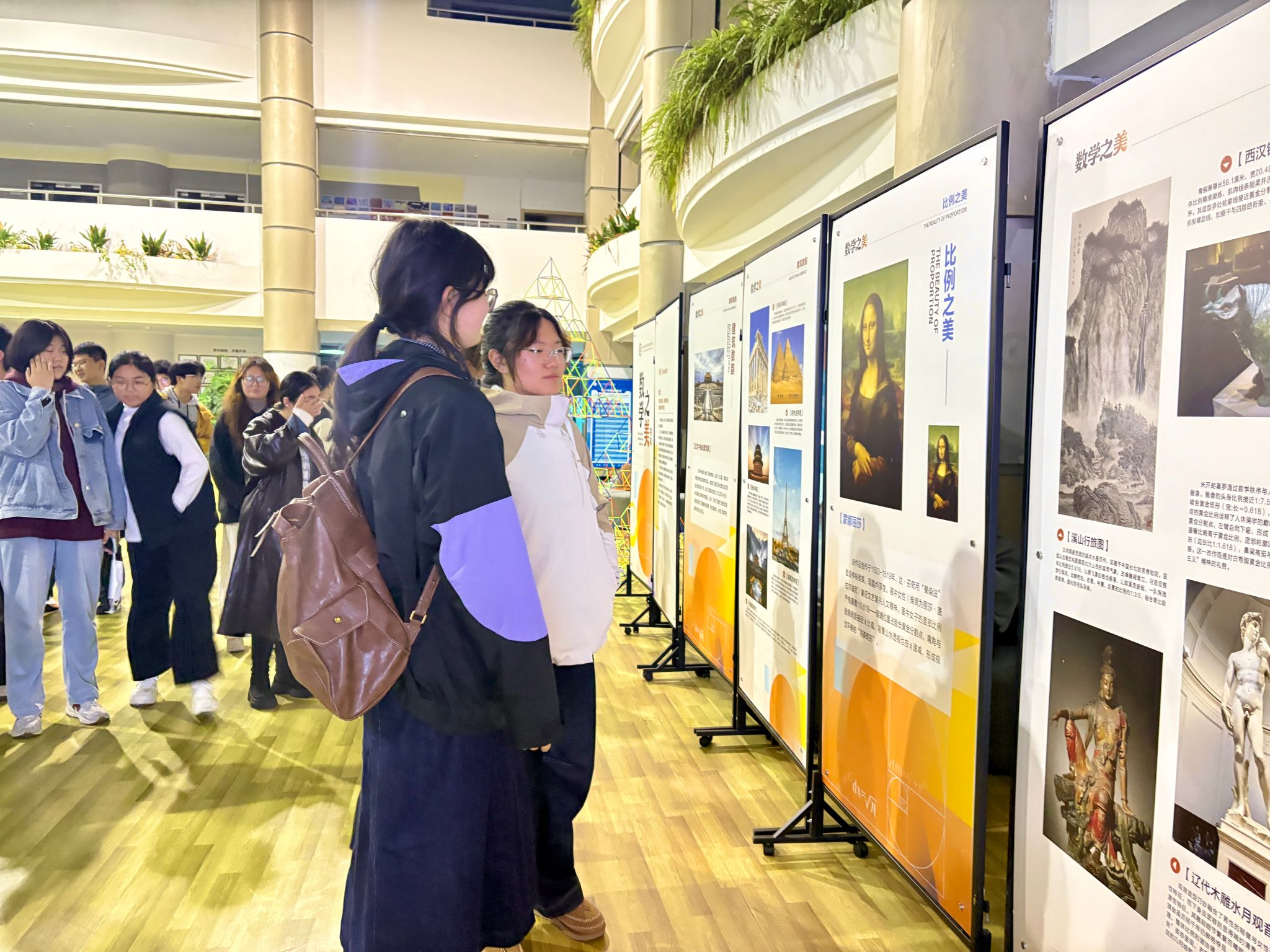 作为学院科普教育创新实践的重要举措,本次特展打破传统课堂边界,将数学文化融入校园生活,设置“比例之美”“公式之魅”“几何律动”“自然数理”“建筑数韵” 五大板块,全方位展现数学在人类文明与日常生活中的美学价值。在“比例之美”展区,《蒙娜丽莎》的黄金分割、范宽《溪山行旅图》的等比构图、西汉青铜犀尊的曲线韵律等艺术瑰宝,揭开了背后严谨的数学逻辑;“公式之魅”板块中,笛卡尔心形线、摆线轨迹、玫瑰线形态等,用简洁公式勾勒出浪漫视觉韵律;“几何律动”通过分形、密铺、对称等概念,解读埃舍尔镶嵌画、蝴蝶翅膀图案、中国传统剪纸中的秩序之美;“自然数理”以向日葵种子排列、宝塔菜分形结构等为例,呈现生物形态中的斐波那契数列与黄金角规律;“建筑数韵”则跨越时空,从北京中轴线、帕特农神庙到侗族风雨桥、埃菲尔铁塔,展现数学在建筑设计中的深远影响。