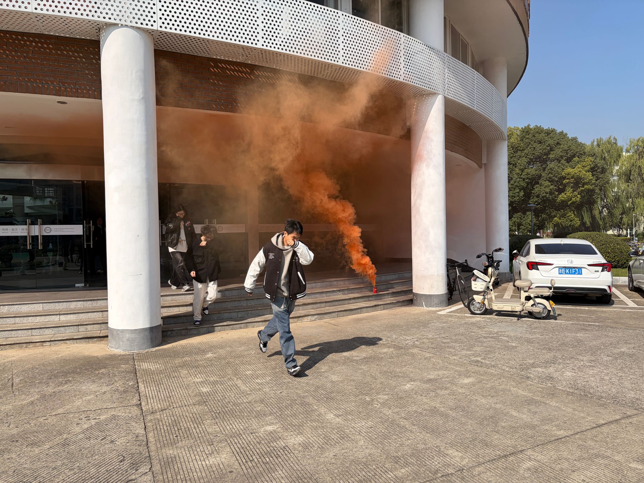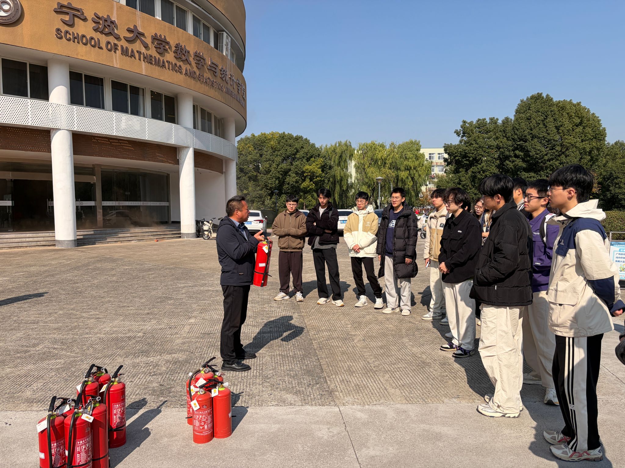 随着警报的拉响和烟雾的弥漫,师生们临危不乱,迅速用衣物或手帕严实掩住口鼻,压低身体,沿着疏散指示标志快速而有序地从楼梯撤离,最终安全抵达楼外的空旷集合点。待全体人员集结完毕,演习进入灭火实操环节。主讲人将看似复杂的灭火器操作规程,精辟提炼为“提、拔、握、压”四字真诀。随着他清晰有力的示范讲解,原本冰冷的钢铁器械,此刻在师生眼中,仿佛幻化成握在手中、守护生命的可靠盾牌。