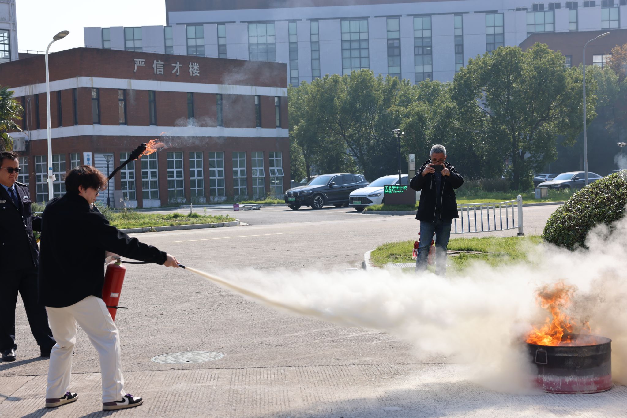 实践灭火环节的到来,瞬间点燃了全场的热情。在专业人员的严密监护下,师生们摩拳擦掌,跃跃欲试。他们勇敢地走上前,沉稳地提起灭火器,利落地拔掉保险销,坚定地握住喷管,果断地压下压把——将课堂所学的“提、拔、握、压”四字要诀迅速转化为精准有力的行动。这亲手扑灭火焰的体验,不仅让师生们扎实掌握了灭火器的操作技能,更让他们切身感受到防范于未然的沉重分量和临危不惧的巨大力量,极大地提升了应对火灾险情的实战自信与处置能力。