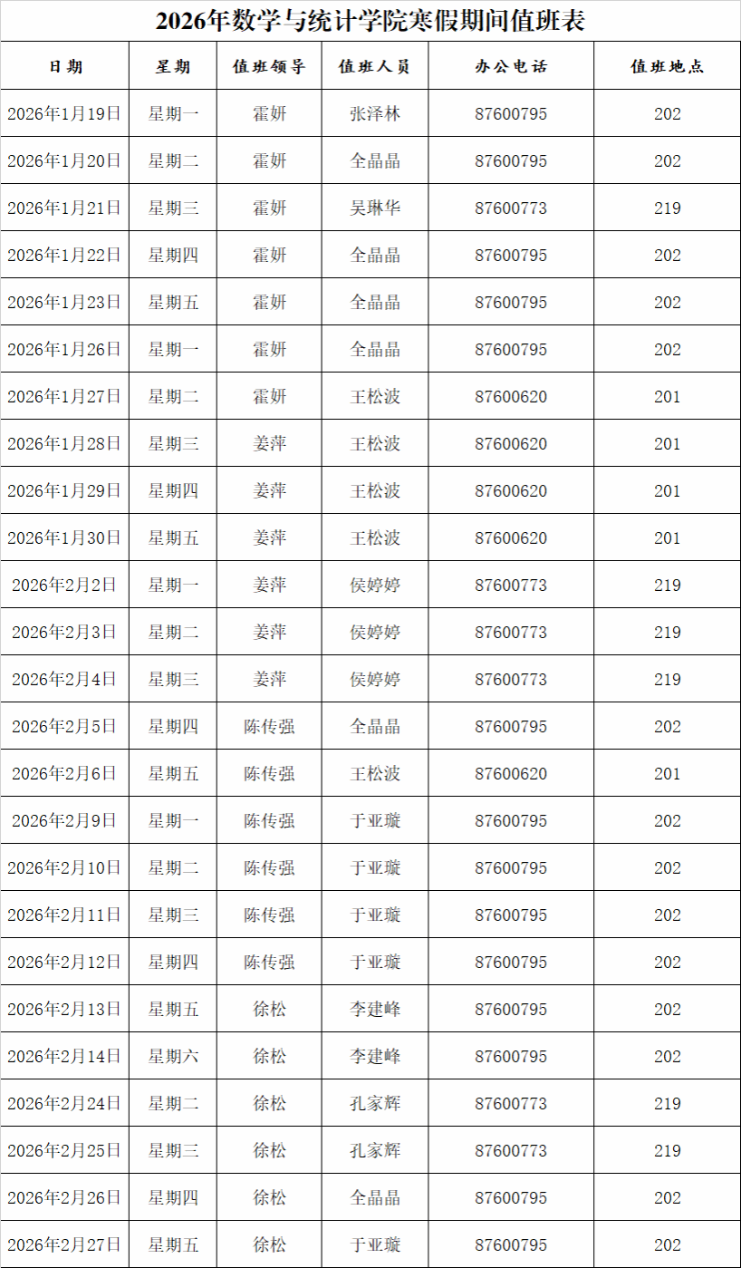根据《51吃瓜 校长办公室关于2026年寒假和假期值班工作安排的通知》中的安排,寒假期间,各单位部门值班人员要明确工作职责,尽职尽责完成值班工作。值班时间为每天8:30-16:00。具体安排如下: