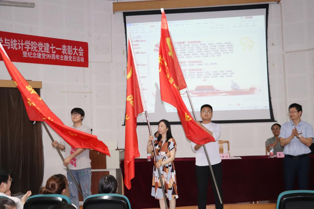 在庄严的国歌声中,表彰大会拉开序幕。曹炜同志带领18位新发展党员面对党旗郑重宣誓,一句句誓词掷地有声、动人心魄,坚定了共产党员的初心使命,激励着全体党员保持奋斗精神,继续在学院发展建设中争当模范。随后,张宾同志宣读了“七一”表彰决定,表彰了2019-2020学年我院各类先进集体和优秀个人。获奖集体和个人充分展示了我院主题教育尤其是抗疫以来各党支部和广大党员的风采。在欢快的颁奖曲中,胡良根同志为获得表彰的先进集体和优秀个人颁发荣誉证书。最后,俞金波同志为“分流搬寝”、“考研辅导”、“清风行动”三支党员突击队授旗,鼓励他们充分发挥党员先锋作用,积极推进学生社区治理,毕业就业、学风建设和安全稳定等工作,为学院各项事业发展做出更大贡献。